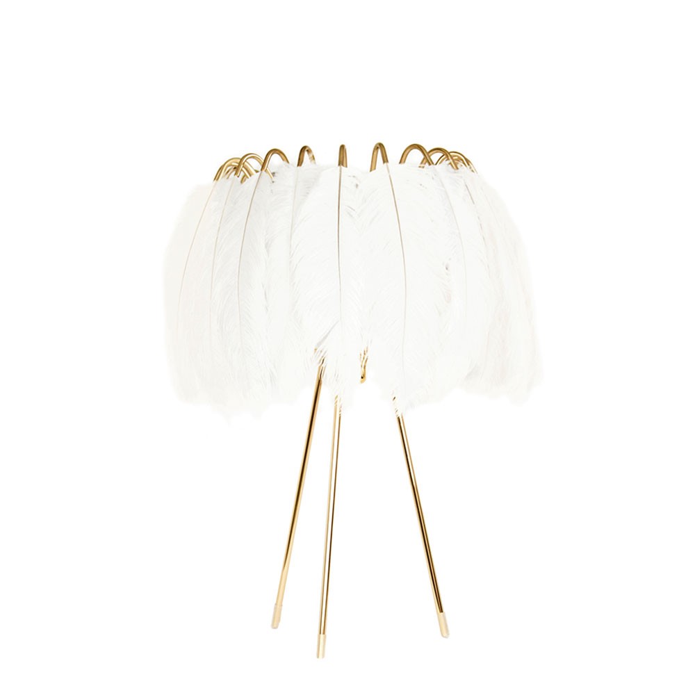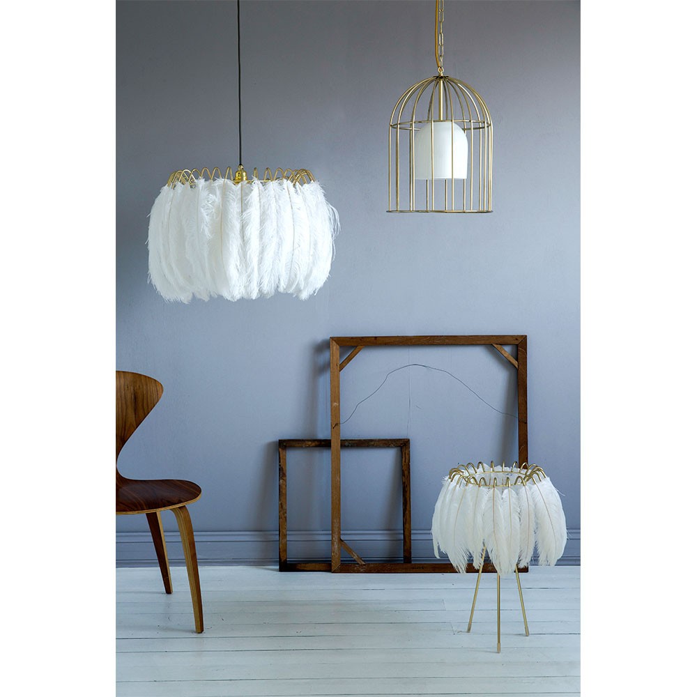 These glamorous feather lamps feature luxurious black or white feathers held in place by a gold metal wire frame. Soft and delicate, the lights are reminiscent of the elegant feather boas and decadent hats of days gone by, but the design is totally contemporary. The Lamps feature a ring of authentic feathers secured by a series of metal gold arms which glow and glint seductively when alight. Available in jet black or pristine white, they come as a pendant or table lamp.