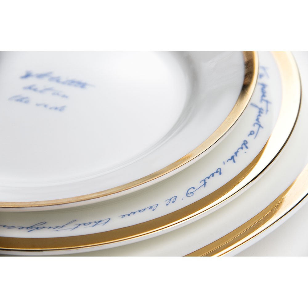 Fine bone china plates with gold lustre edging and blue text. The large 10.5-inch plate features a love poem written from the plate to you. It reads "I love the way you look at me, and the way you use your knife. I love the way you eat your food, you give meaning to my life." The texts are written in a romantic handwritten style of an old love letter complete with dips of ink and imperfections.